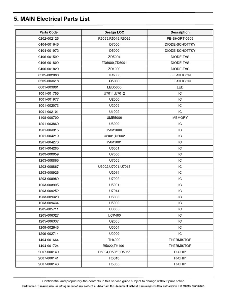 MAIN Electrical Parts List Parts Code Design LOC Description
