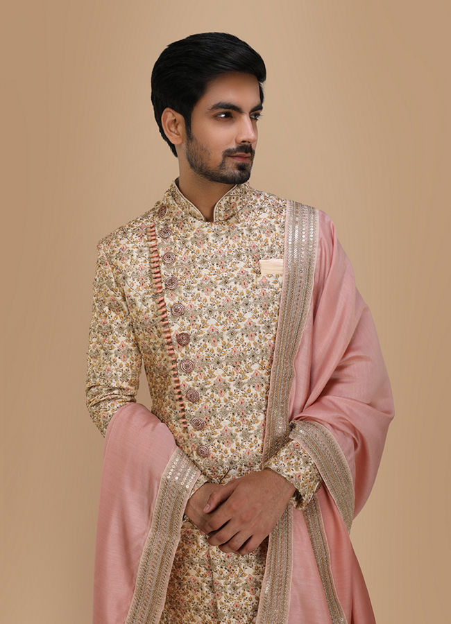 Cream Floral Self Patterned Sherwani