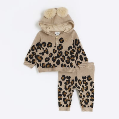 Baby girls brown knitted leopard jumper set River Island