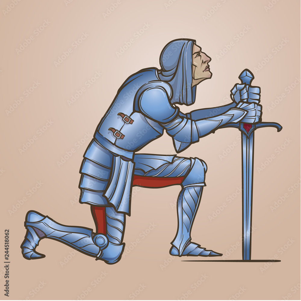 Stockvector Medieval knight kneeling down and offering his service