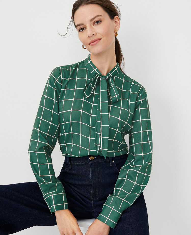 Windowpane Tie Neck Blouse