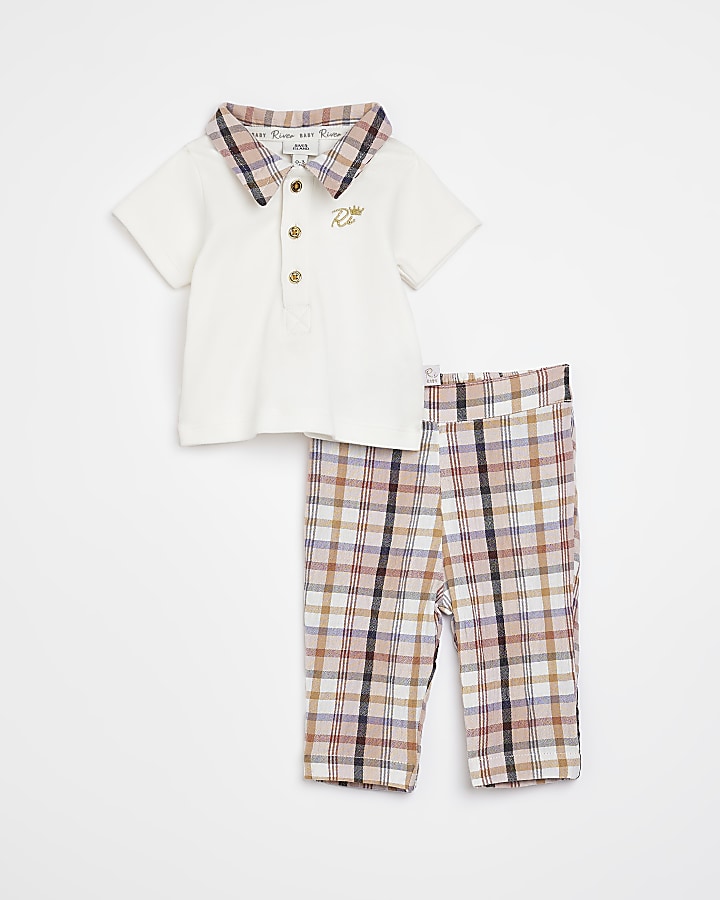 Baby boys Ecru check polo and Trouser Set River Island