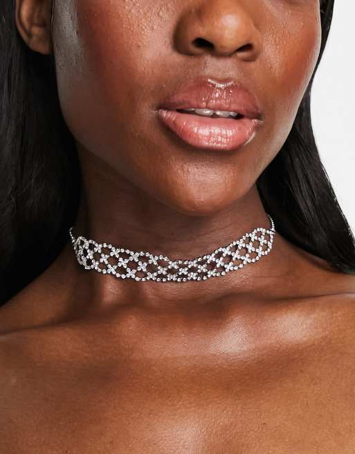 ASOS DESIGN Choker ketting met geweven ontwerp met kristallen in zilverkleur