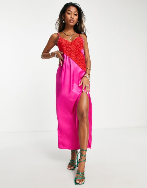 Topshop contrast lace colour block slip dress in pink