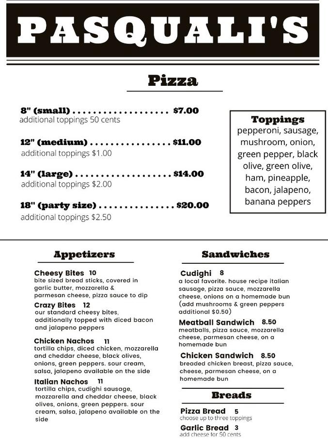 Pasquale's pizza menu 2025, Menus Pasquale Pizza 2025