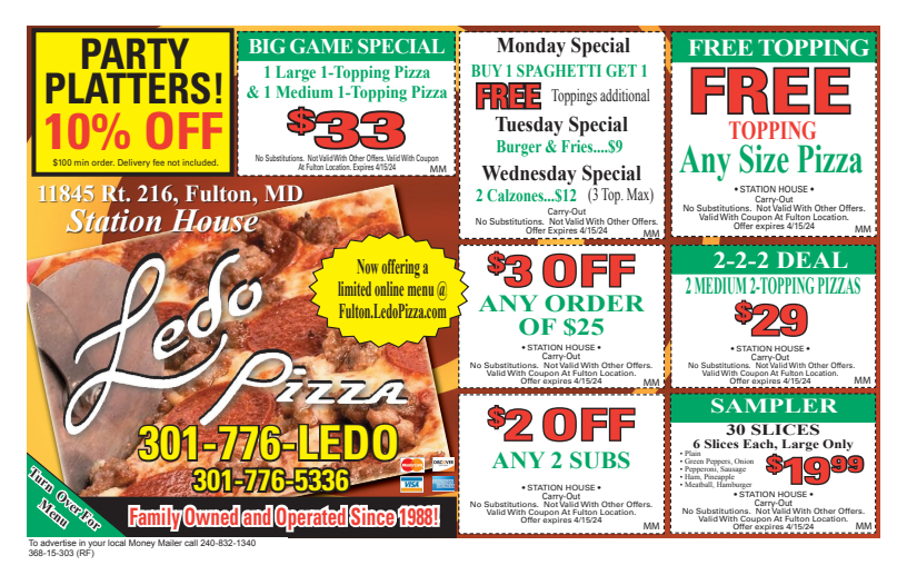 Ledo Pizza Coupon Promo Fulton MD Money Mailer