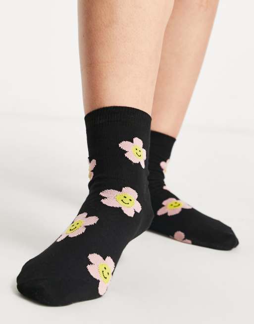 ASOS DESIGN ankle socks with happy flower print in black