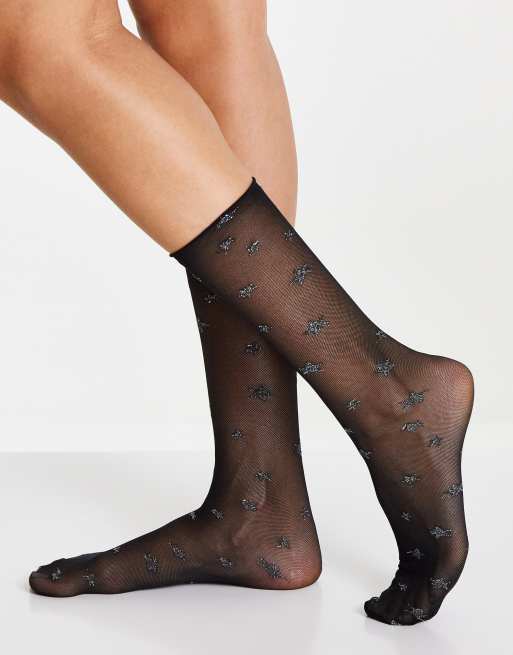 ASOS DESIGN calf length sheer socks in glitter star print in black