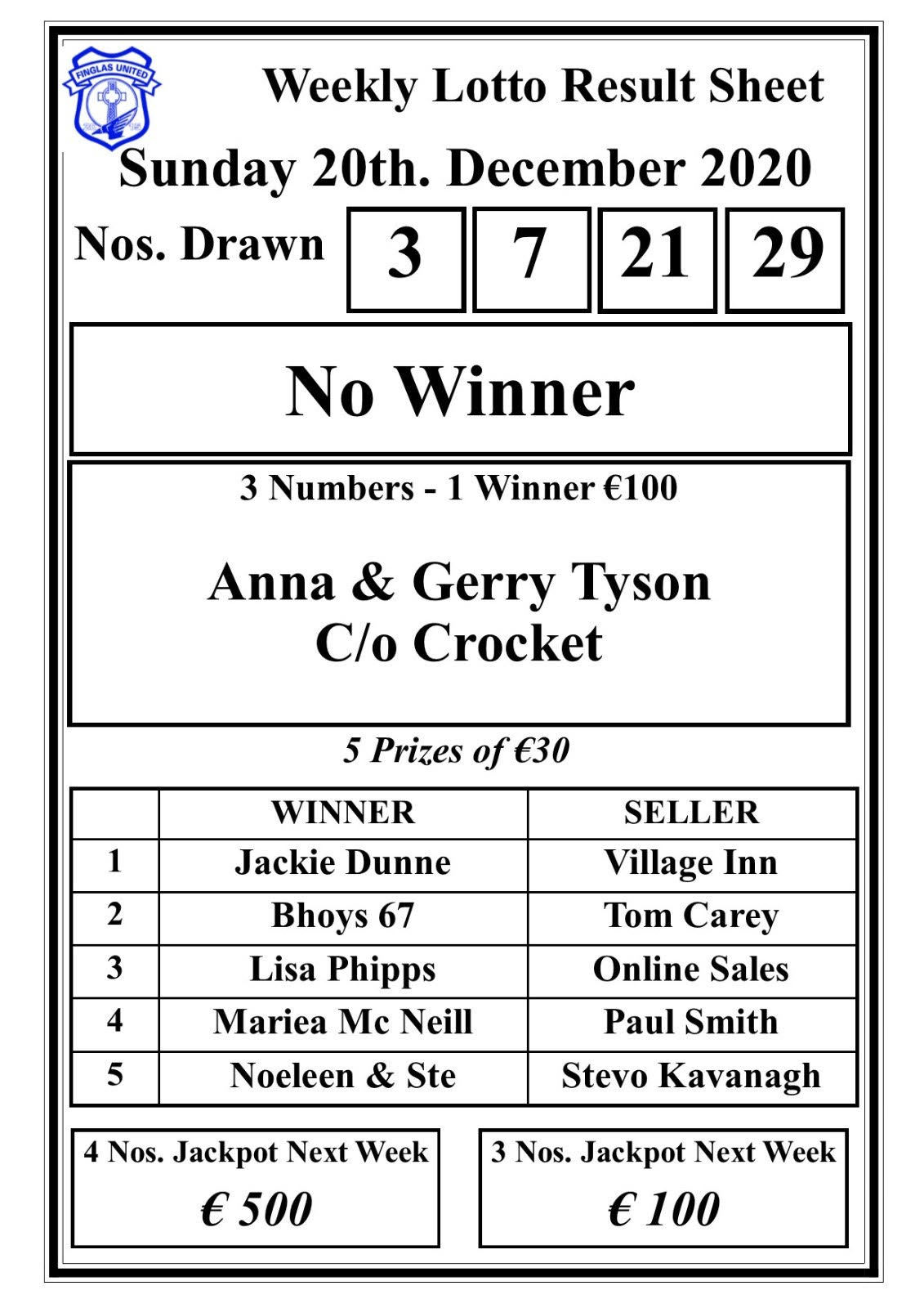 December 4 lotto results 2025, Finglas United Youth Football Club Club Lotto results 20th of 2025