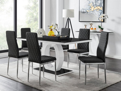 Giovani Rectangular 6 Seat White High Gloss Unique Halo Dining Table Black Glass Top 6 Black Faux Leather Silver Leg Milan Chairs