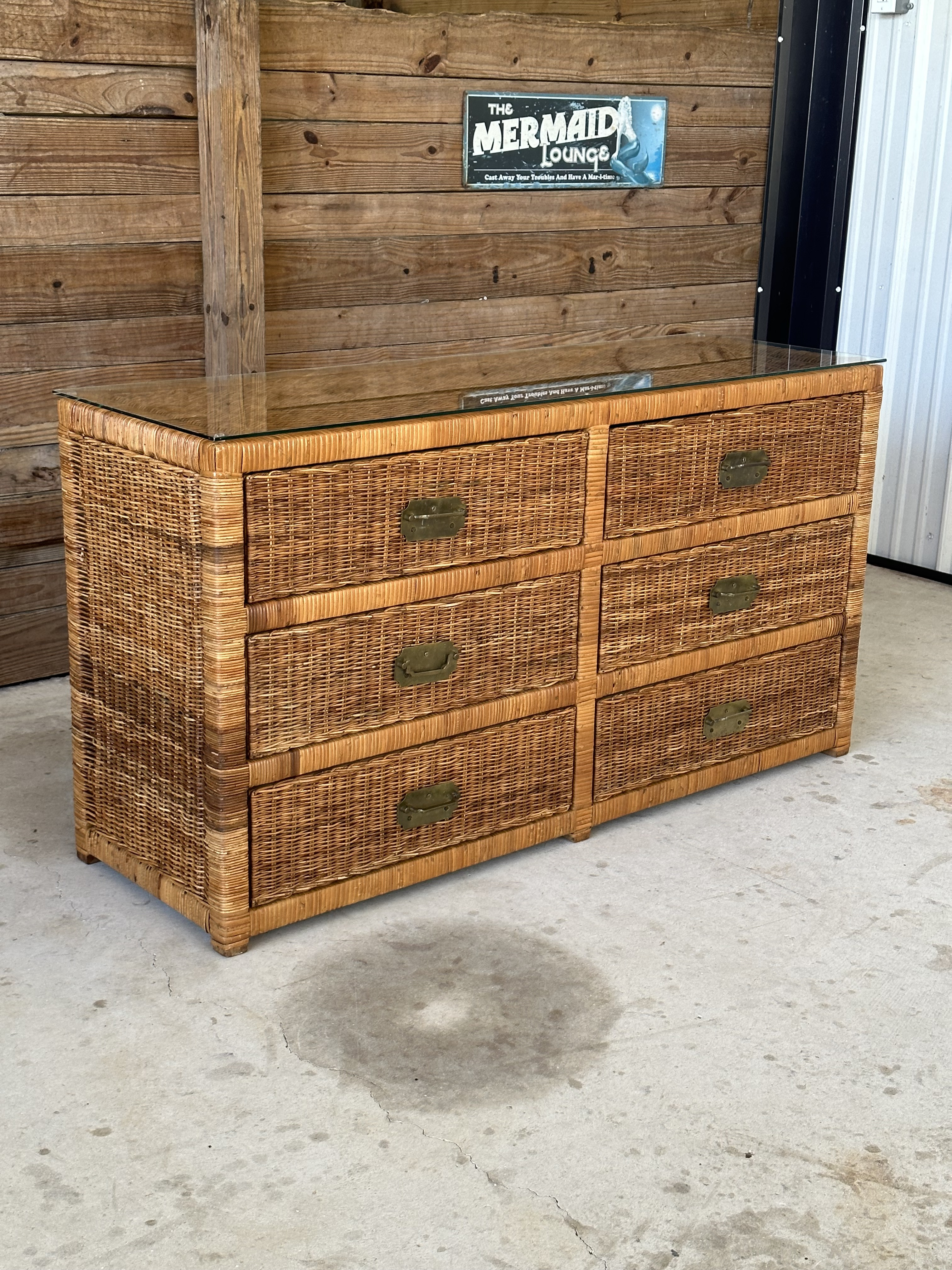 Vintage Coastal Floating Wicker Rattan Wrapped Six Drawer Dresser
