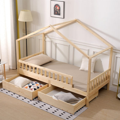 FurnitureHMD 3FT Solid Wood Kids Bed Single Bed Frame with 2
