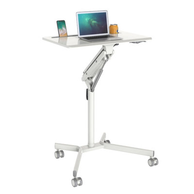 Duronic WPS57 Sit Stand Desk With Tablet Support Cup Holder Table on Wheels Adjustable Height Reach 70x52cm