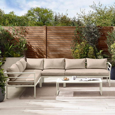 Furniturebox UK Montenegro White Metal 6 Seat Outdoor Garden Sofa Set Taupe Cushions 6 seat corner sofa metal coffee table