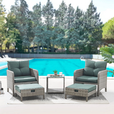Grenada Garden Armchair 5 piece Grey Rattan Set with Side Table Ottoman Hide Away Footstools Green Cushions
