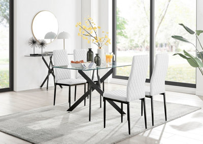 Furniturebox Leonardo 4 Seater Rectangular Glass Dining Table with Silver Metal Legs 4 White Milan Faux Leather Black Leg Chairs