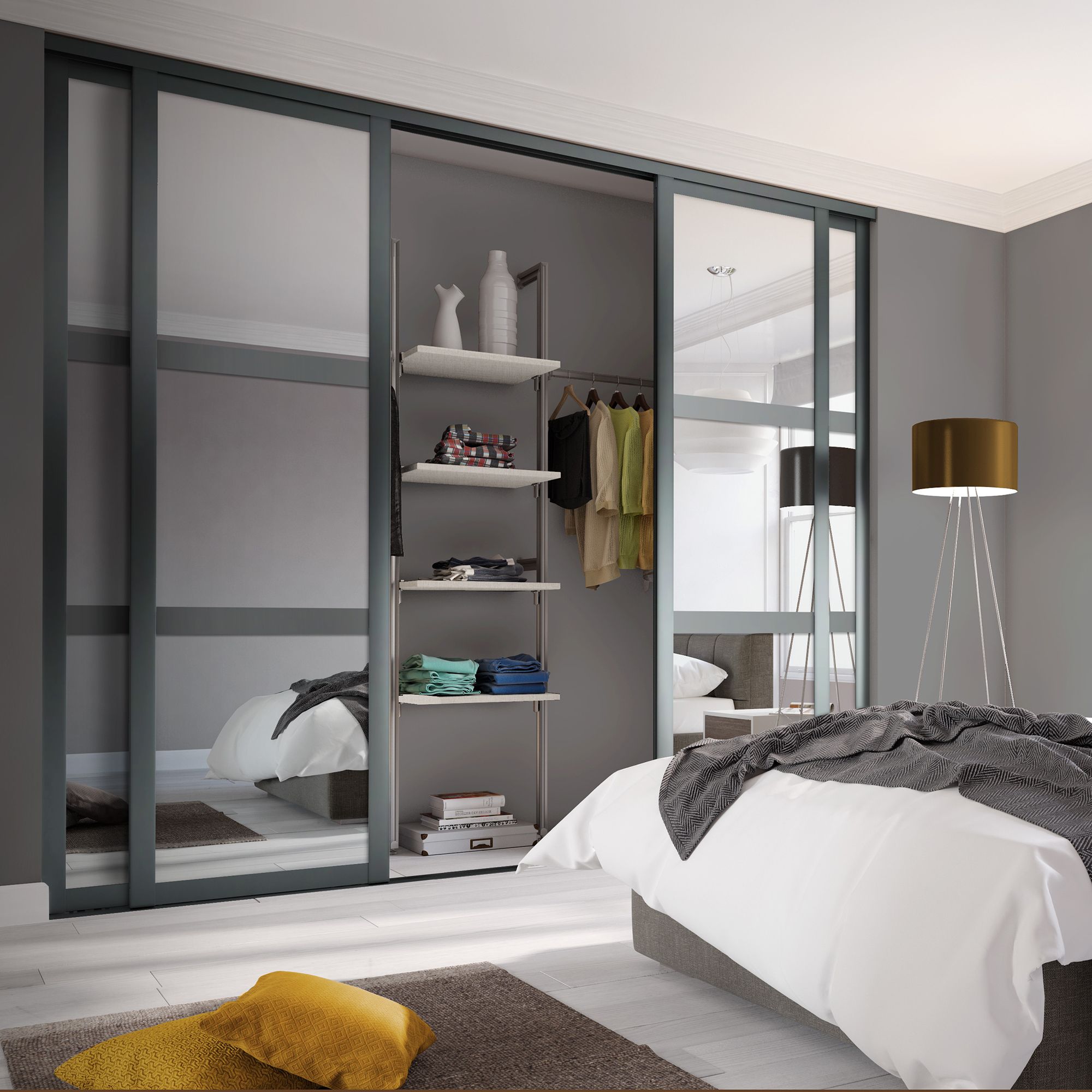 Panel Shaker Mirrored Graphite 4 door Sliding Wardrobe Door kit H 2260mm W 2290mm
