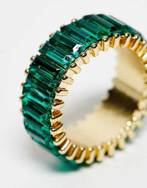 ASOS DESIGN ring with green baguette crystal stones in gold tone