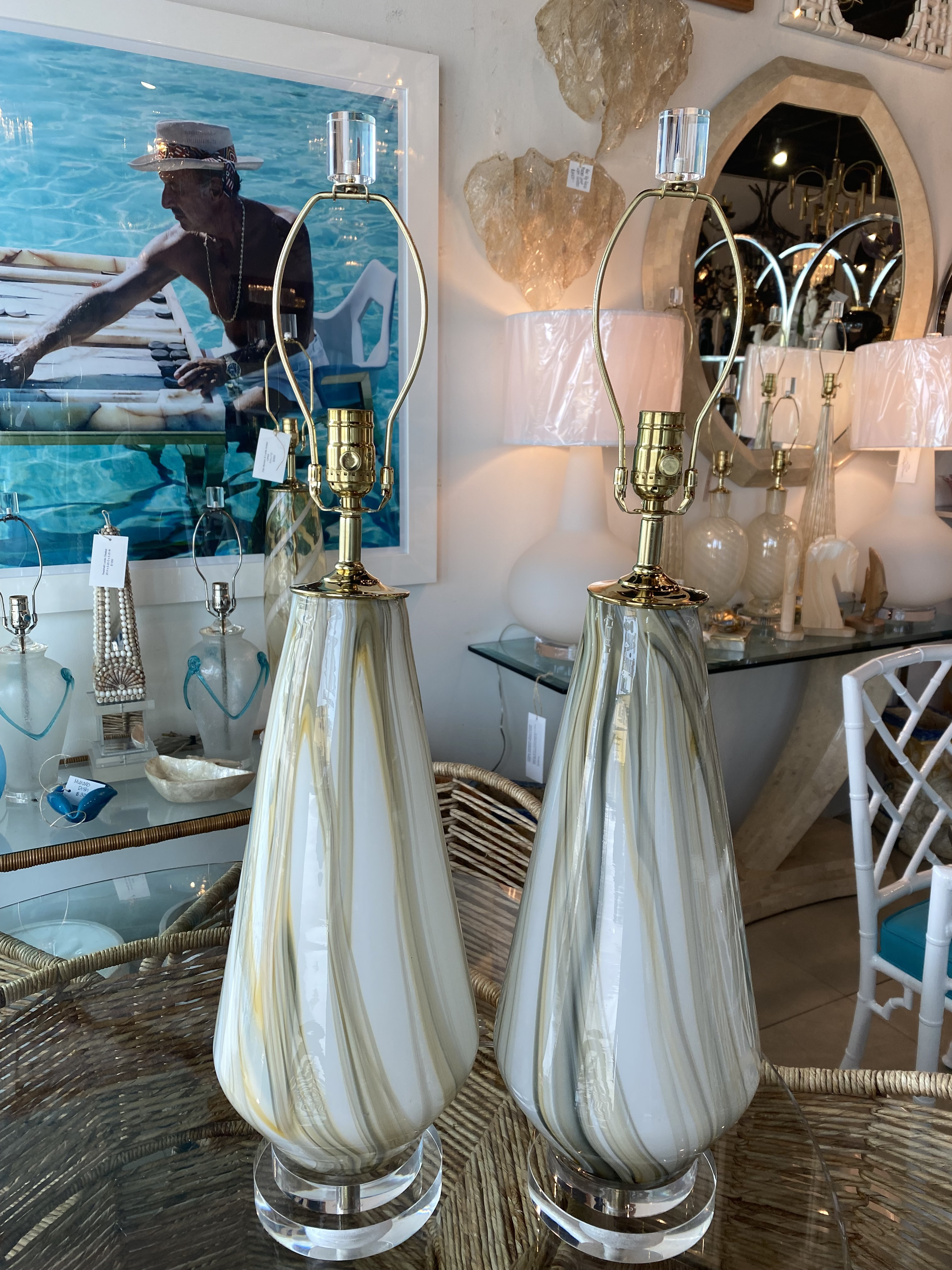 Vintage Large Murano Marble Swirl Glass Table Lamps Lucite Brass