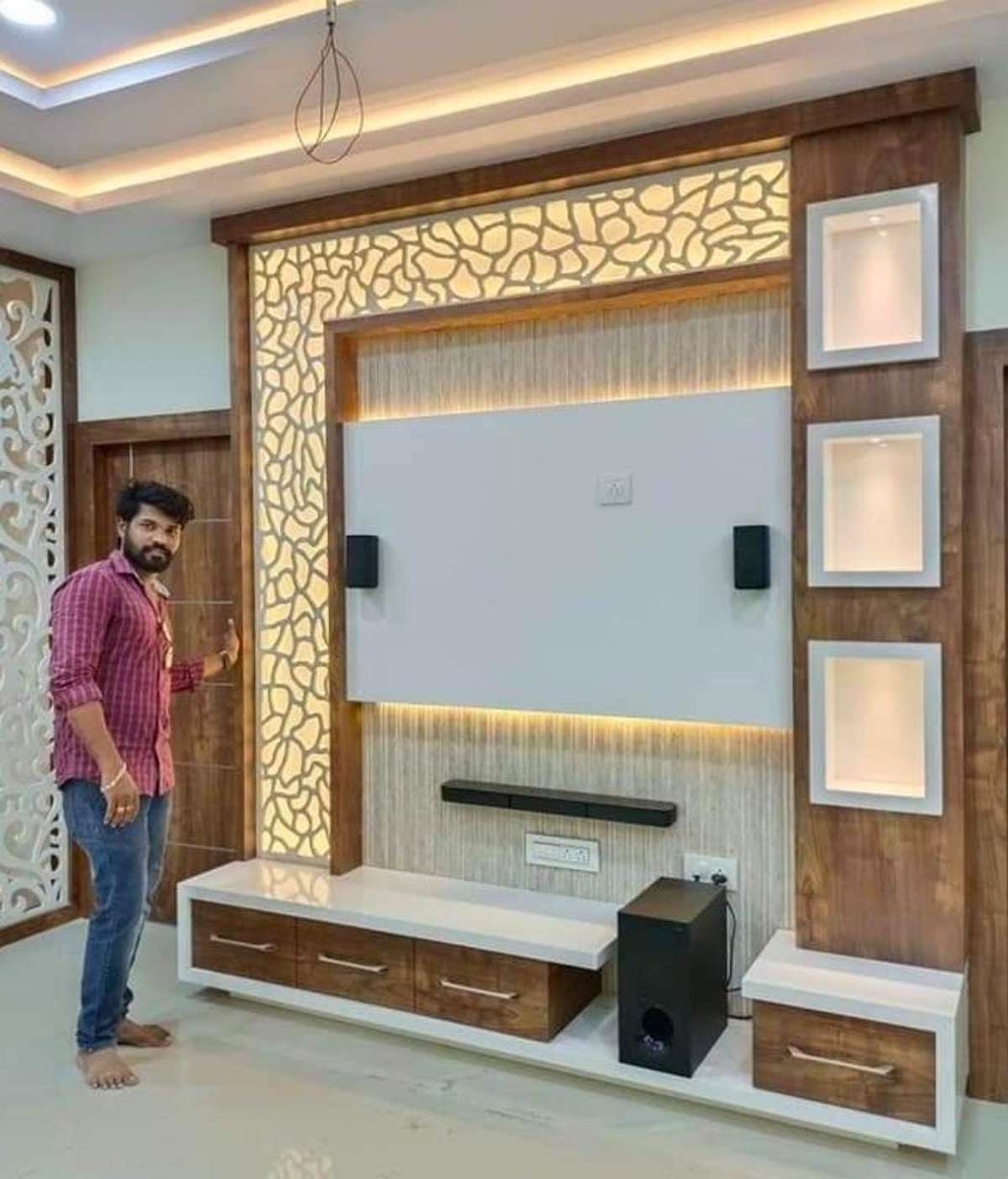 Mdf jali design with light 2025, Lighting Living Storage Designs by Interior Designer RS 2025