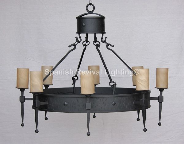 1936 8 Old World Spanish Wrought Iron Chandelier with Glass Candles