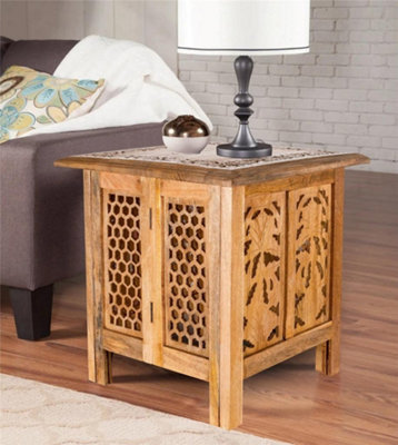 Antique Effect Square Carved Wooden Bedside Lamp Table Side End