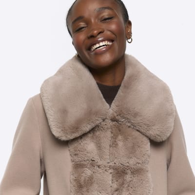Brown faux fur collar 2025, Brown faux fur trim coat River Island 2025